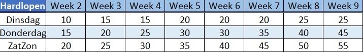 Het doel is om vanaf het voorjaar voorzichtig wat trails te lopen. Hiervoor zal ik in principe 3 looptrainingen en 1 fietstraining per week doen maar dat laatste is van ondergeschikt belang aan het lopen dus dit zal ik niet iedere week doen. De looptraingen voor de komende weken zien er als volgt uit: