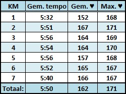 Het doel was dus 45' maar het liep vanaf stap 1 al best lekker en toen ik ingehaald werd door zo'n dikke 100 scholieren op de fiets wou deze oude, logge man toch wel even wat laten zien en probeerde ik zo recht en soepel mogelijk te lopen en versnelde ik mijn pas. Dat ging eigenlijk relatief makkelijk en daardoor bleef ik in een hoger tempo lopen dan gepland... Na een dikke 3 km betaalde ik daar de prijs voor en moest ik er heel hard voor werken. Echt langzamer lopen wou ik eigenlijk ook niet dus besloot ik het rondje maar iets korter te maken. Bij het station ben ik even gestopt toen een jongen voor mij een kleine epileptische aanval kreeg en op de grond viel. Net als zijn geld, portemonnee en bril Hij mankeerde verder gelukkig niks maar nadat ik hem overeind geholpen had was mijn hartslag wel lekker van 164 naar 119 gedaald. Vervolgens ben ik in een (voor mijn gevoel) iets rustiger tempo naar huis gerend maar als ik de statistieken van deze loop bekijk (zie afbeelding) is dat niet echt zo.... Heel raar.. Maar goed, moe maar uiterst voldaan kwam ik dik bezweet thuis aan, ondanks dat ik in korte broek en korte mouwen heb gelopen. Het was slechts 5 graden maar het voelde helemaal niet koud aan. Zal wel geen wind hebben gestaan.Heerlijk zo'n winter!!!!