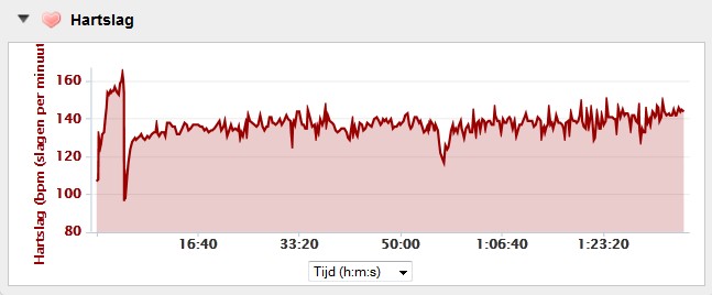 Zo gezegd zo gedaan. Onder dreiging van een bui zijn we tegen half 8 weggelopen en hoewel de 700 meter naar zijn huis ietwat moeizaam gingen ging het daarna toen we samenliepen wel heel makkelijk. Dat van dat eerste stuk kun je ook wel zien aan de hoge hartslag van het begin. Het dipje na een klein uur is trouwens een plaspauze van Bob waarin ik rustig doorgewandeld heb.