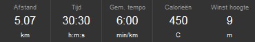 Ik ben gaan lopen zonder verder op het tempo te letten. Ik heb meer op gevoel gelopen en op zoek gegaan naar een tempo wat nog net lekker was zonder heel hard te hoeven werken zeg maar. Het lopen ging ook vandaag niet vanzelf maar naar omstandigheden ging het uitstekend. Naast de 5 km die ik gerend heb ook nog eens 450 calorieën verbrand. Dik tevreden dus!