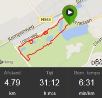 Het hoofddoel was vandaag een duurloopje van een half uur maar dat alleen als doel vind ik wat weinig. Ik zoek meestal een doel in het doel om buiten de benen ook het brein ook een beetje op gang te houden tijdens het lopen. Vandaag was dat om een strak tempo aan te houden van 6:00 min/km om zo in dat half uur precies 5 km te rennen.